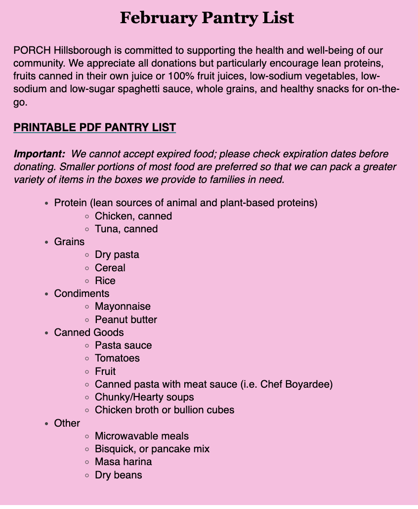 PORCH is a local nonprofit that provides fresh and nonperishable food to families facing food insecurity.