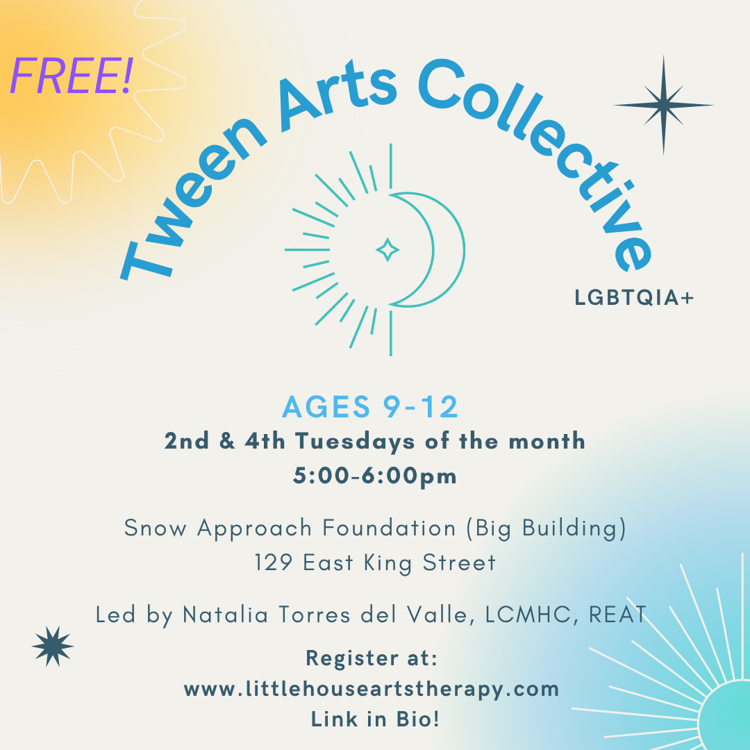 This bi-monthly (2nd and 4th Tuesdays) drop-in open studio group offers a safe and creative space for LGBTQIA+ identifying tweens to gather in community and explore self-expression through the arts. Tweens can enjoy the process of creating in any form they feel connected to- visual, music, writing, movement, or drama.